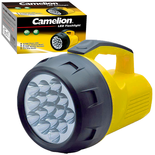 Φακός Camelion με 16 LED υψηλής φωτεινότητας. μπαταρίες 4D/4R25 Πλαστικό κέλυφος σε κίτρινο χρώμα. Αδιάβροχος.