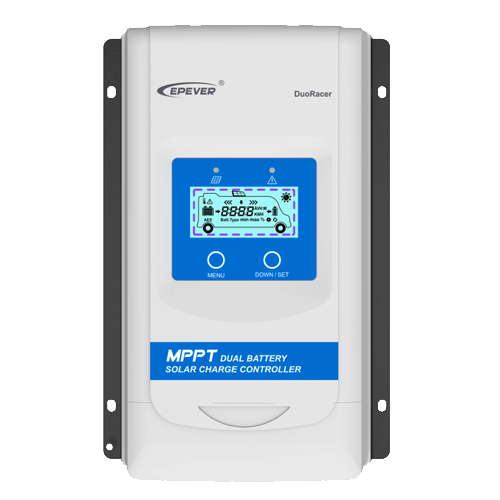 Το DuoRacer MPPT charge controller είναι κατασκευασμένο για να φορτίζει δύο μπαταρίες (παρουσιάζονται ως κυρίως μπαταρία (BATT1) και μπαταρία εκκίνησης (BATT2) παρακάτω) ταυτόχρονα σε ηλιακό σύστημα. Αυτό το controller υποστηρίζει πολλών ειδών κυρίως μπαταρίας (BATT1) όπως Sealed, Gel, Flooded, LiFePO4 και Li-NiCoMn, που είναι κατάλληλες για RV, Camper, πλοία κ.α.. Η συσκευή αναγνωρίζει αυτόματα τη τάση του συστήματος της μπαταρίας εκκίνησης (BATT2) και φορτίζει με μειωμένο ρεύμα την μπαταρία στις ανάλογες συνθήκες.
