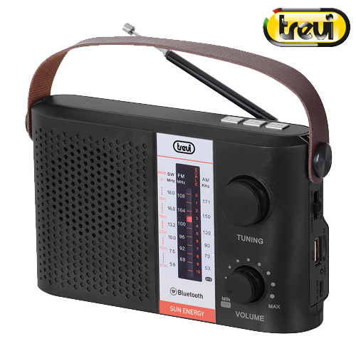 Φορητό ηλιακό ραδιόφωνο Trevi RA 7F25. Με μεγάλη ευαισθησία και ακρίβεια συντονισμού. Εκτός από την ακρόαση των αγαπημένων σας σταθμών, με το φορητό ραδιόφωνο Trevi μπορείτε επίσης να παίξετε μουσική από μνήμες flash, όπως USB Sticks και MicroSD ή απευθείας από τις συσκευές σας μέσω ασύρματης σύνδεσης Bluetooth. Το ραδιοφωνάκι της Trevi RA 7F25 BT  τροφοδοτείται από εσωτερική μπαταρία λιθίου, επαναφορτιζόμενη μέσω υποδοχής micro-USB και ενσωματωμένου ηλιακού πλαισίου που βρίσκεται στο πίσω μέρος του ραδιοφώνου.